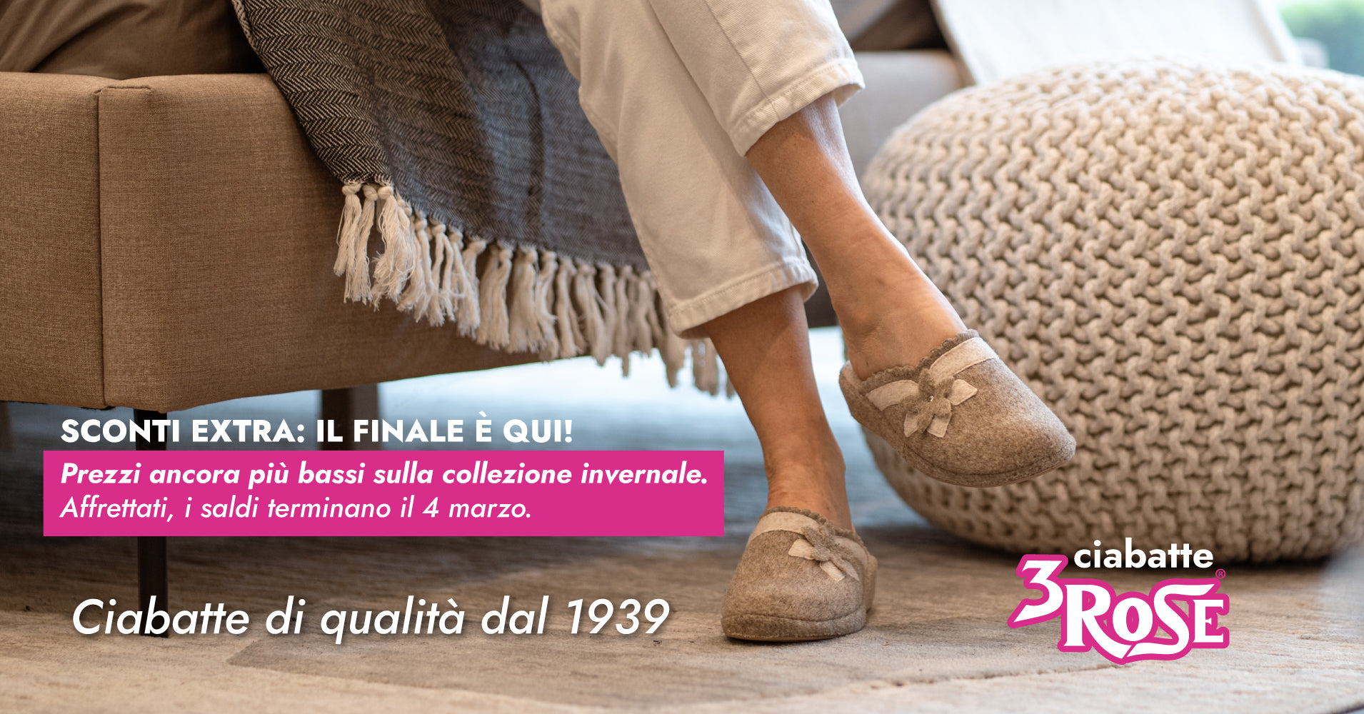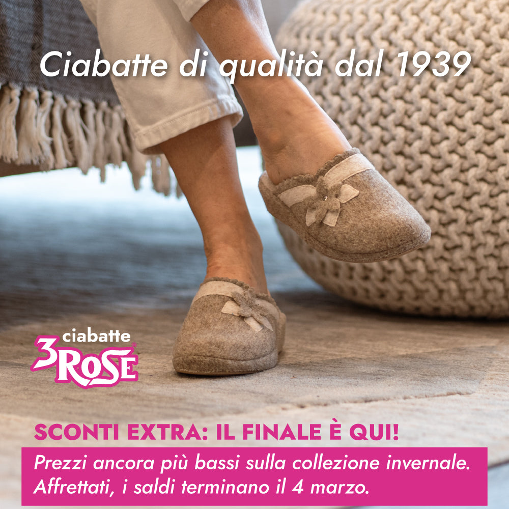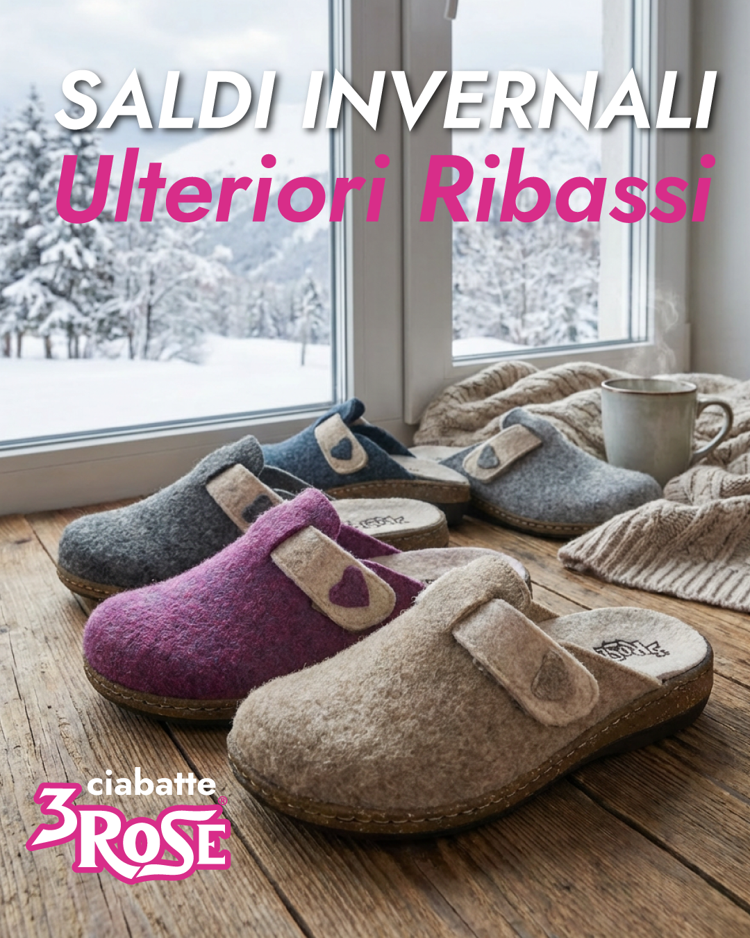 Scopri 3 Rose, il marchio che unisce artigianalità e comfort nelle sue ciabatte fatte a mano. Ogni modello è progettato per garantire il massimo benessere, grazie al plantare estraibile anatomico, che si adatta perfettamente al tuo piede. Scegli tra ciabatte in spugna per l'estate o ciabatte in lana cotta e ecopelle per l'inverno o le 4 stagioni, ideali per ogni stagione. Comode, pratiche e di alta qualità, le ciabatte 3 Rose sono perfette per il relax a casa. Regolabili con velcro e disponibili in diverse varianti, offrono un comfort su misura. Acquista ora online!