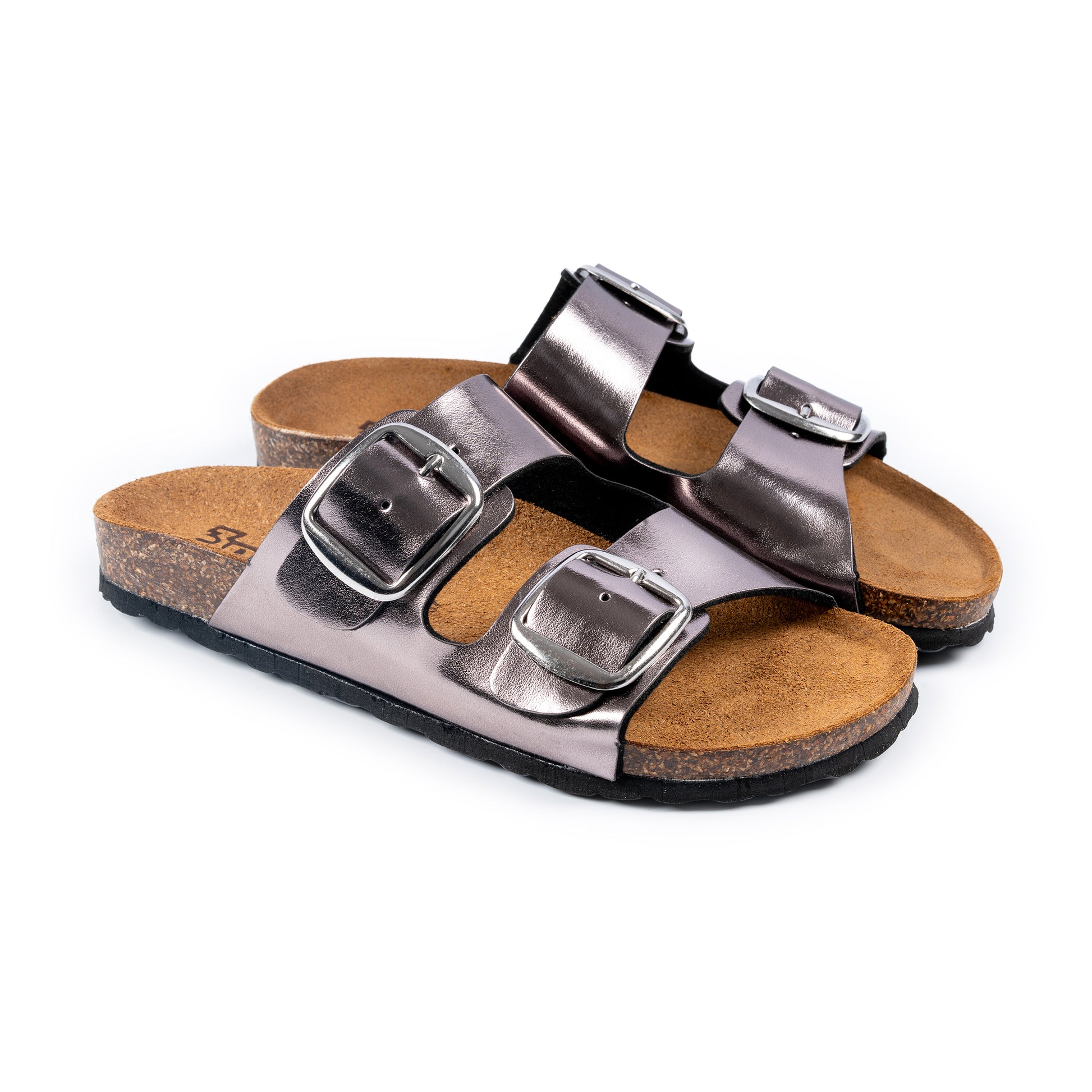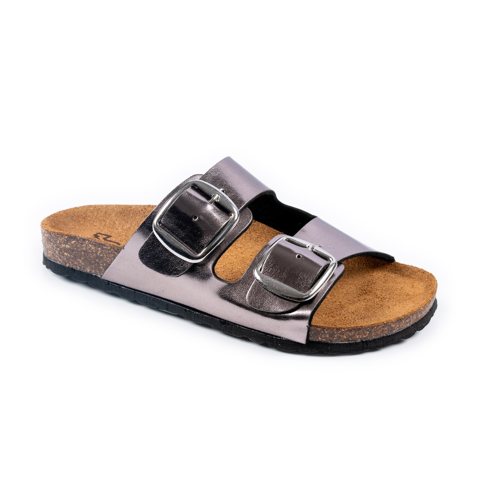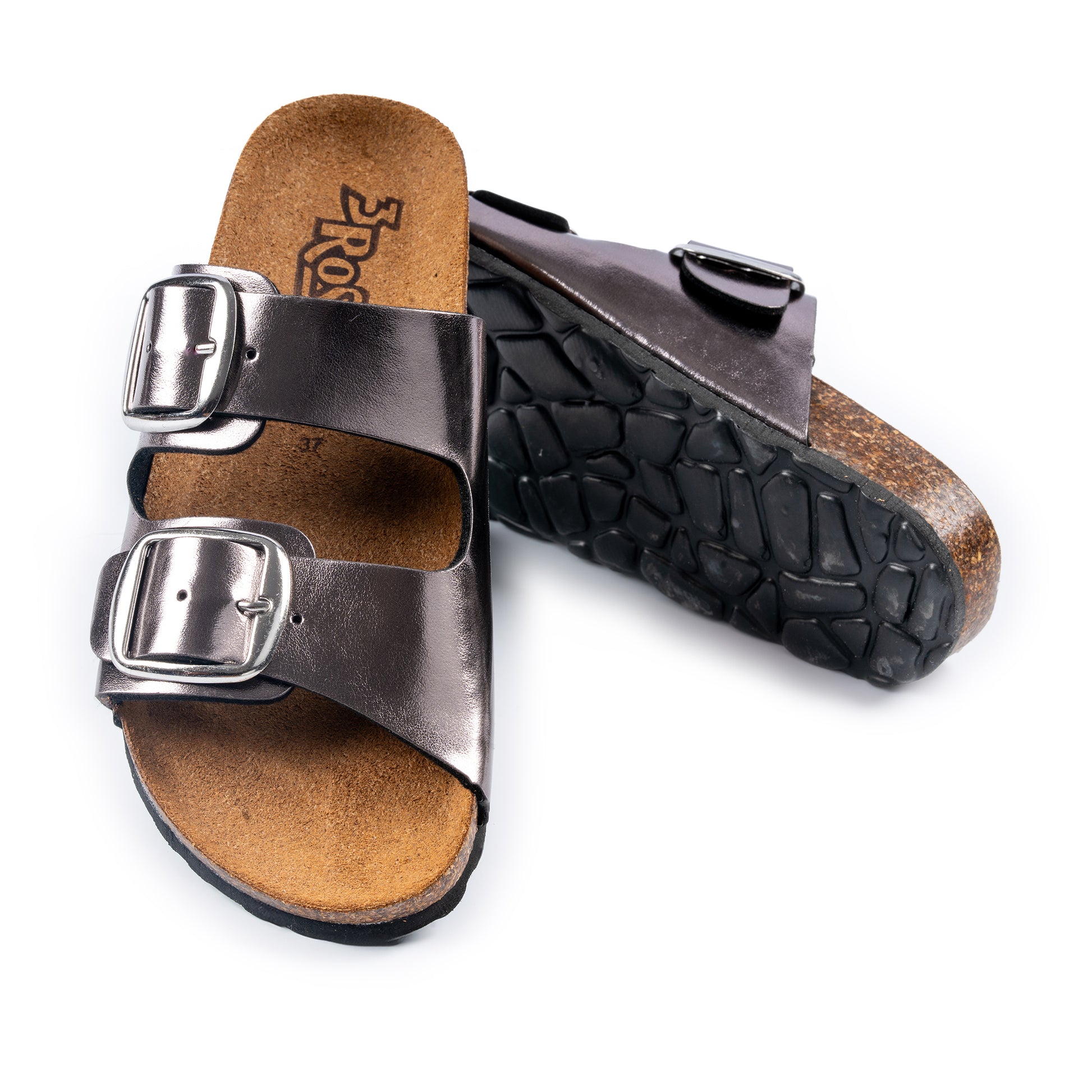 Ciabatta a doppia fascia con tomaia in ecopelle laminata, impreziosita da fibbie regolabili che permettono una calzata personalizzata. Il sottopiede in pelle garantisce morbidezza e traspirazione, mentre il fondo anatomico effetto sughero offre sostegno e comfort anche nelle lunghe passeggiate. La suola in poliuretano, leggera e resistente, completa il design pratico e moderno di questa ciabatta, perfetta per unire comodità ed eleganza.