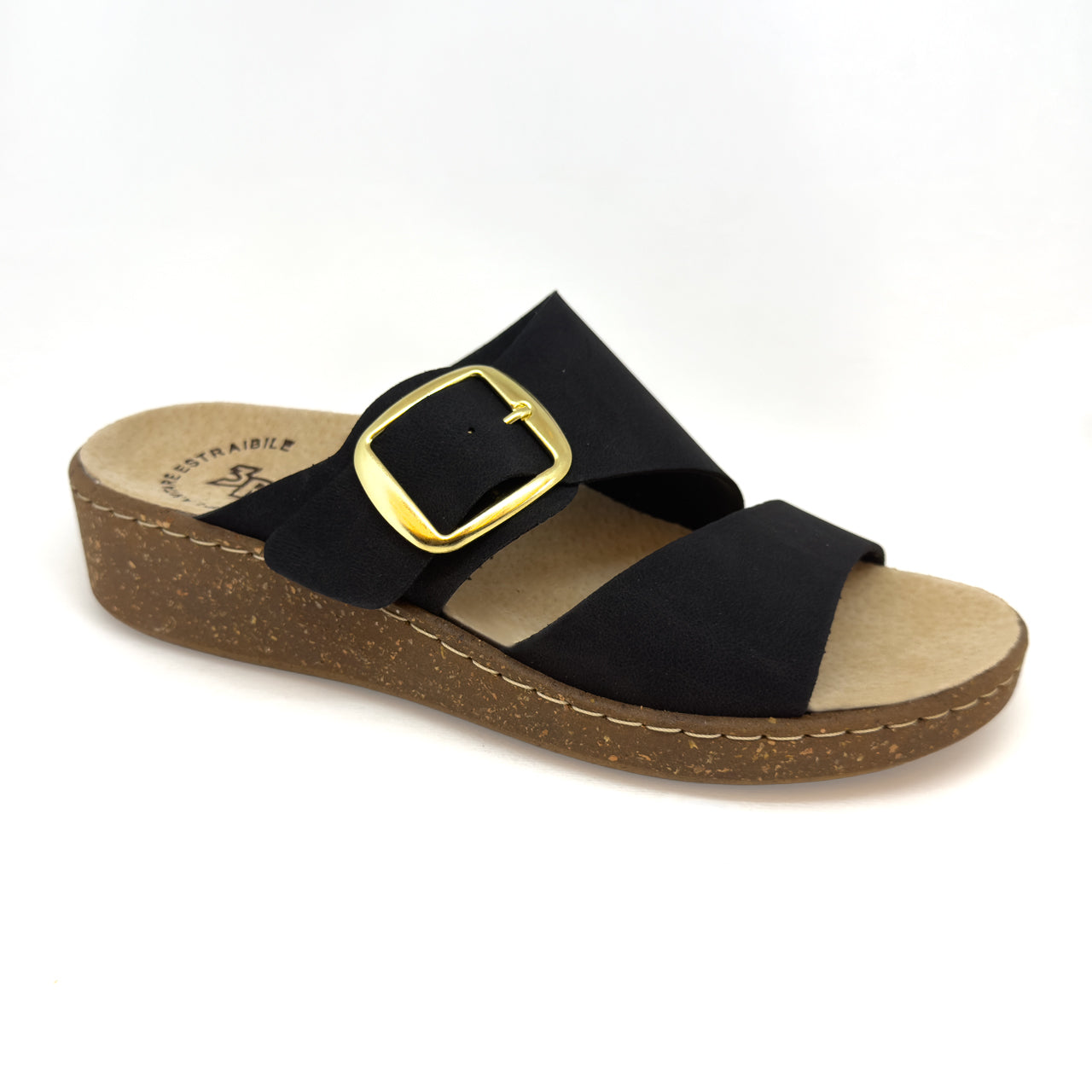 Essenziale, comoda e sempre attuale la ciabatta in ecopelle effetto nabuk è caratterizzata da doppia fascia con fibbia regolabile, per una calzata pratica e personalizzata. Plantare in pelle estraibile, comodo e pratico, da poter sostituire con un vostro plantare ortopedico. Zeppa effetto sughero da 4,5 cm.