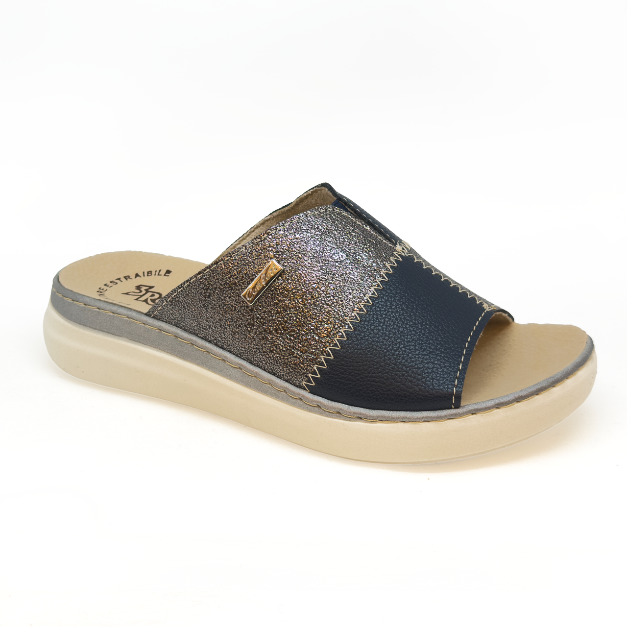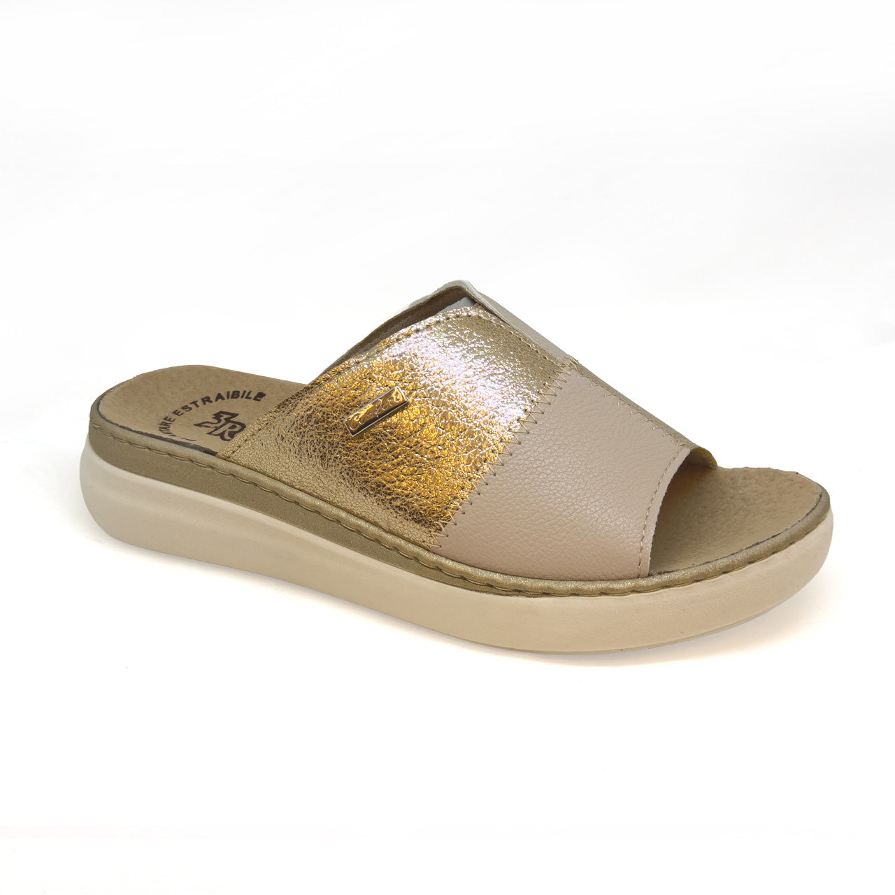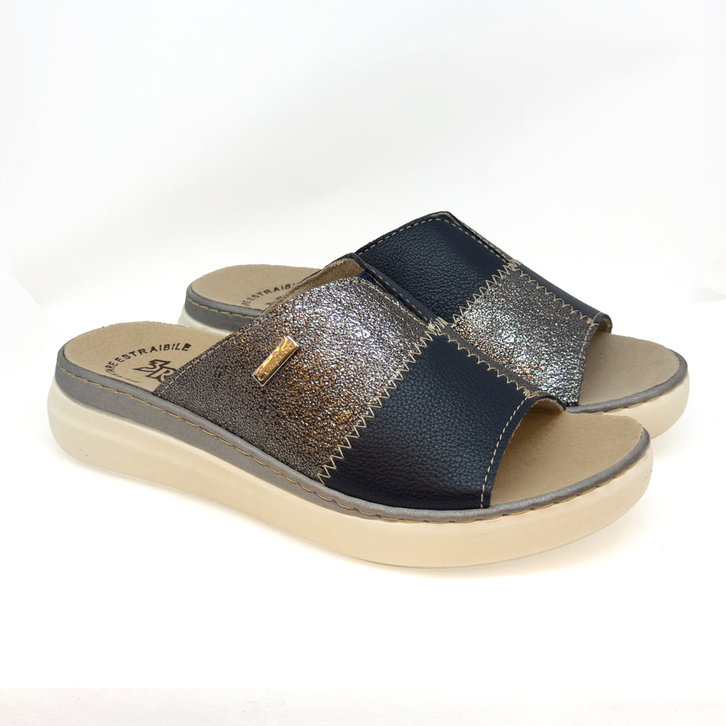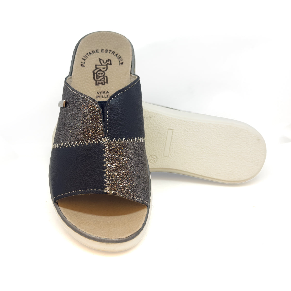 Moderna e versatile, la ciabatta 3Rose realizzata in ecopelle doppio colore con elegante effetto laminato, illumina il look con un tocco raffinato e contemporaneo. Fascia unica dal design essenziale e femminile. Elastico centrale per una migliore vestibilità e maggiore comfort. Il sottopiede è in pelle, con plantare anatomico estraibile per essere eventualmente sostituito con un vostro plantare ortopedico. Il fondo in gomma antiscivolo, leggero e flessibile, tacco da 4,5 cm che assicura stabilità e comfort.