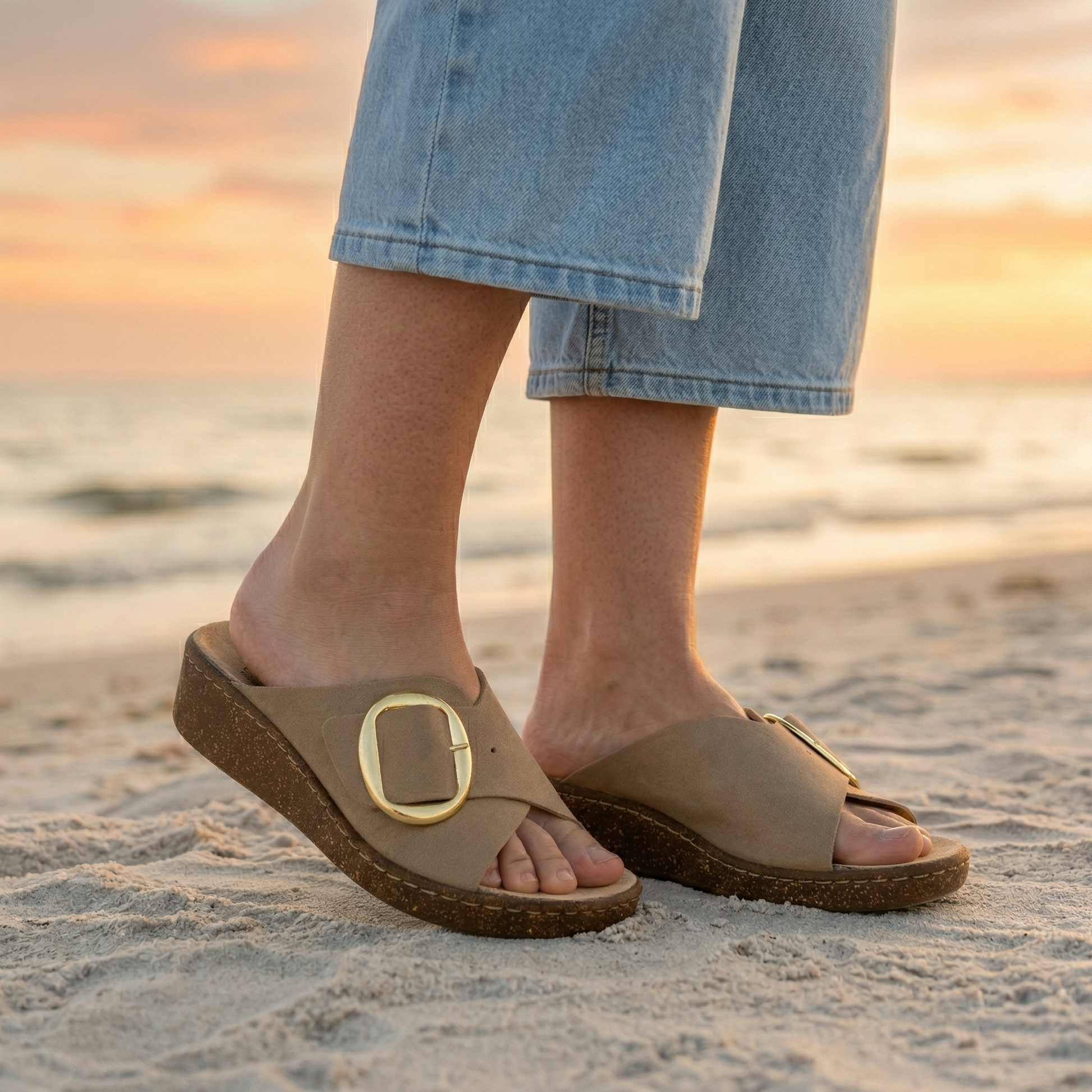 Stile e comfort si incontrano in questo modello dal design ricercato. La fascia in ecopelle effetto nabuk con fibbia valorizza il piede e garantisce una calzata regolabile e stabile. Zeppa effetto sughero da 4,5 cm leggera e di tendenza. Sottopiede in pelle per un comfort naturale e plantare estraibile, pratico e funzionale da poter sostituire con un vostro plantare ortopedico