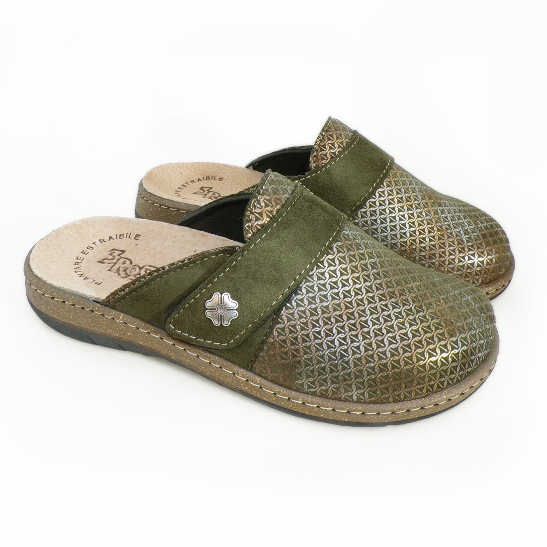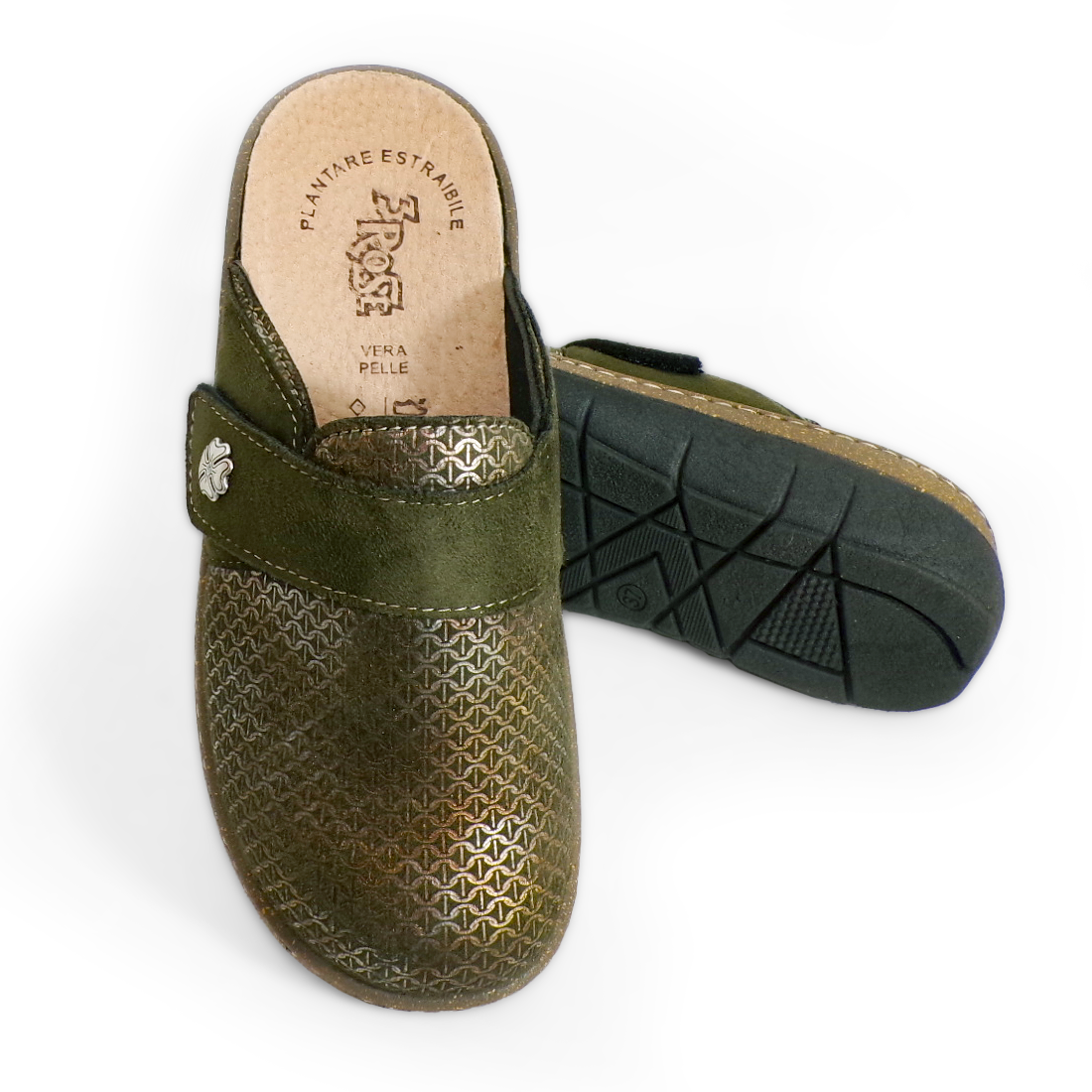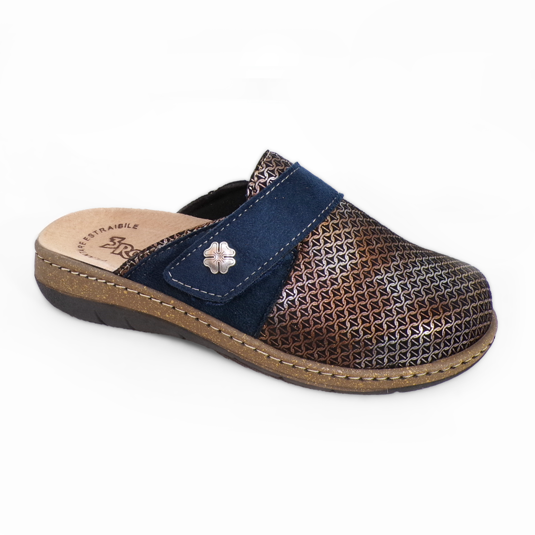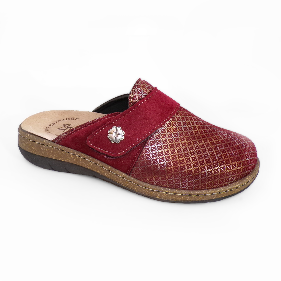 Elegante e confortevole, la ciabatta con tomaia in microfibra elasticizzata è perfetta per l'uso quotidiano. La fodera in licra e la chiusura con velcro regolabile assicurano una calzata sicura e personalizzata. Il plantare anatomico estraibile e il sottopiede in pelle garantiscono il massimo comfort, può essere sostituito da un vostro plantare ortopedico. La suola antiscivolo e la zeppa da 3,5 cm offrono stabilità e leggerezza. Disponibile nei colori Blu, Bordeaux, Verde.