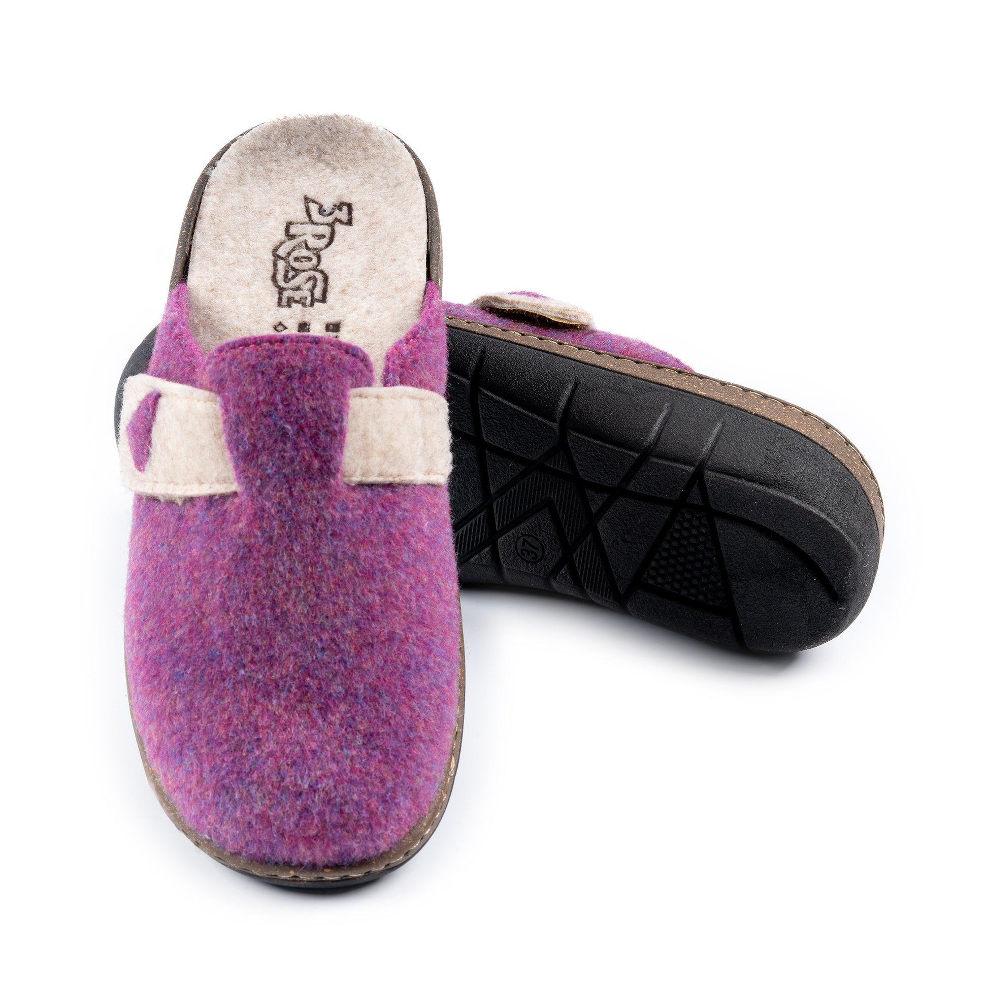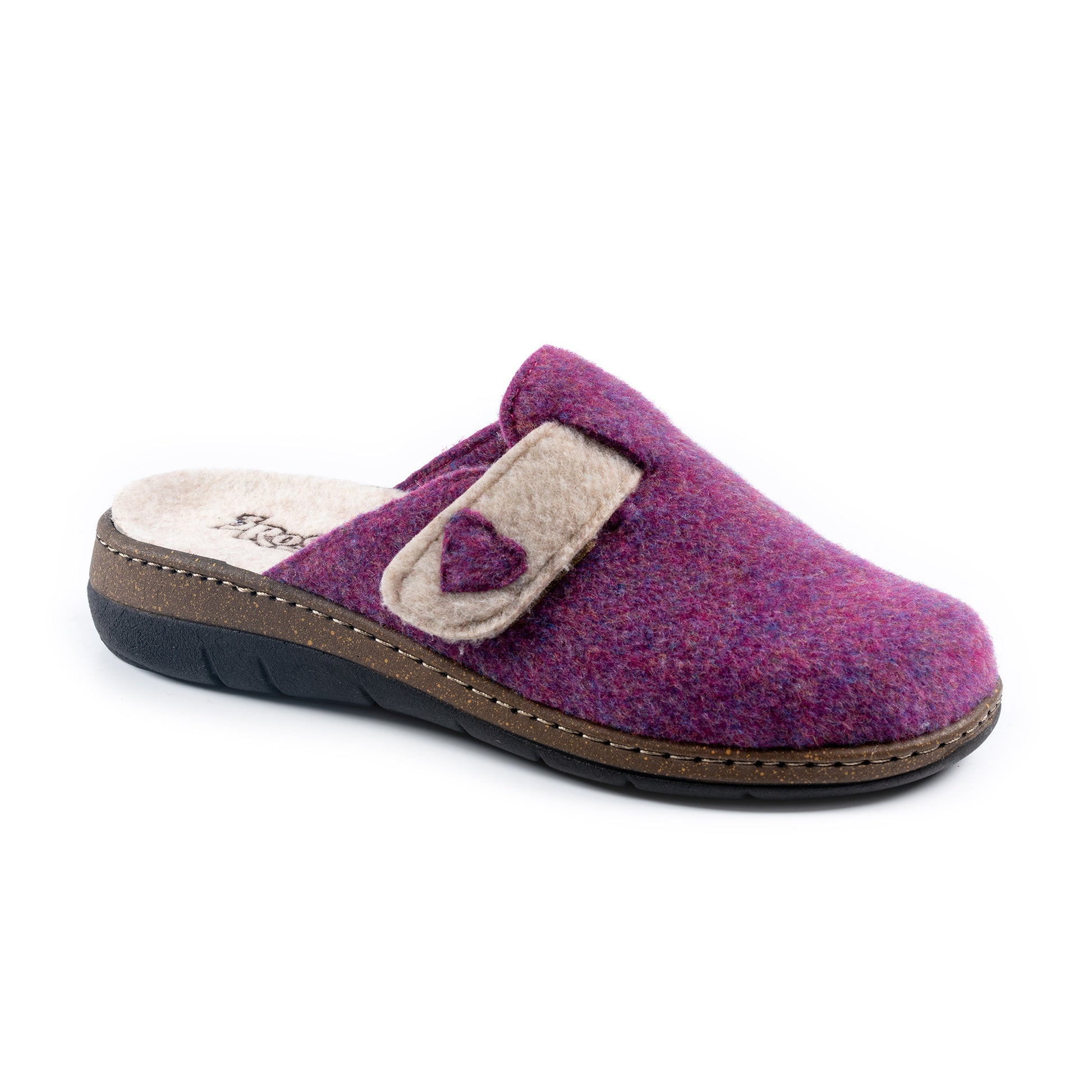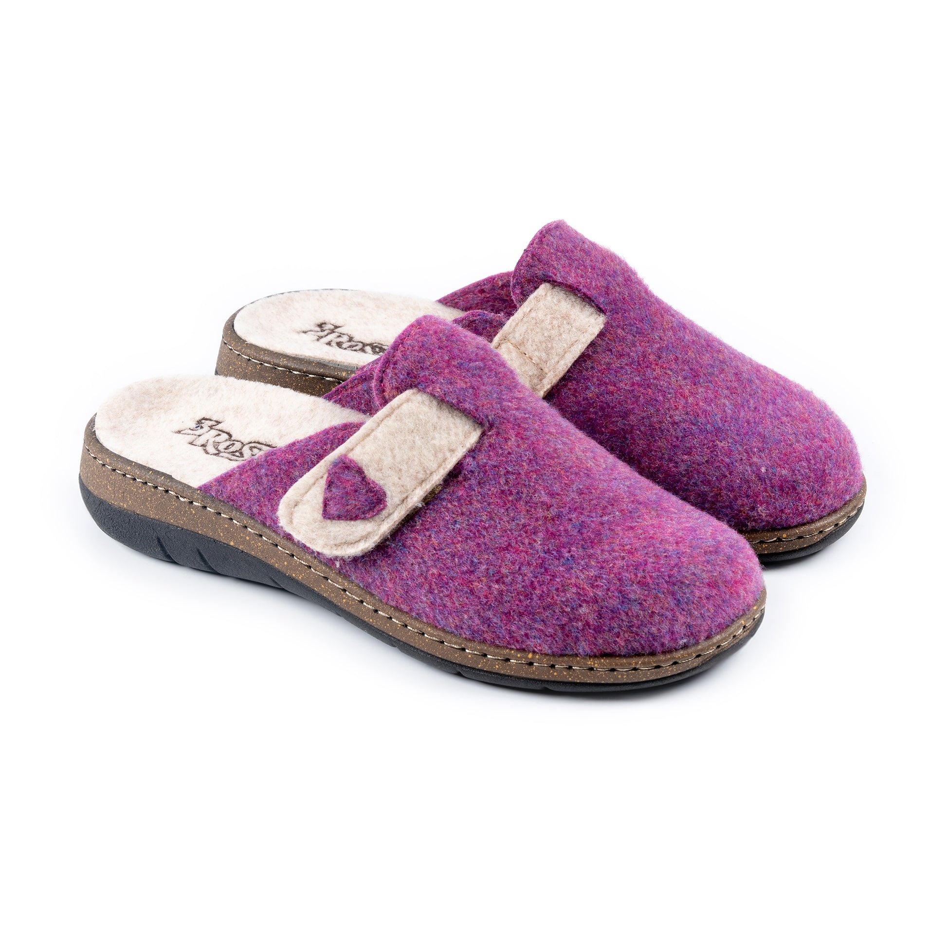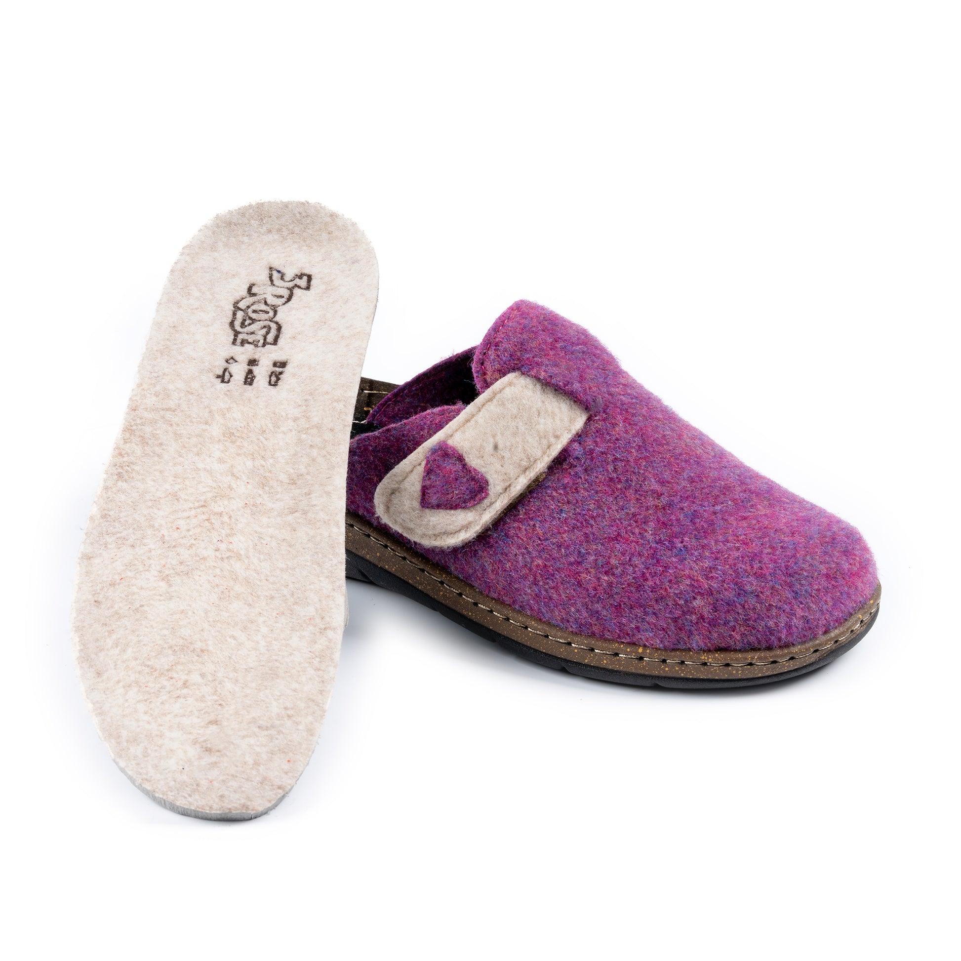 Comoda e versatile, la ciabatta con tomaia in feltro offre comfort duraturo. Il velcro regolabile assicura una calzata sicura, mentre il plantare anatomico estraibile e il sottopiede in feltro garantiscono benessere, esso può essere sostituito con un vostro plantare ortopedico. La suola antiscivolo e la zeppa da 3,5 cm offrono stabilità. Disponibile nei colori avio, beige, grigio, prugna.