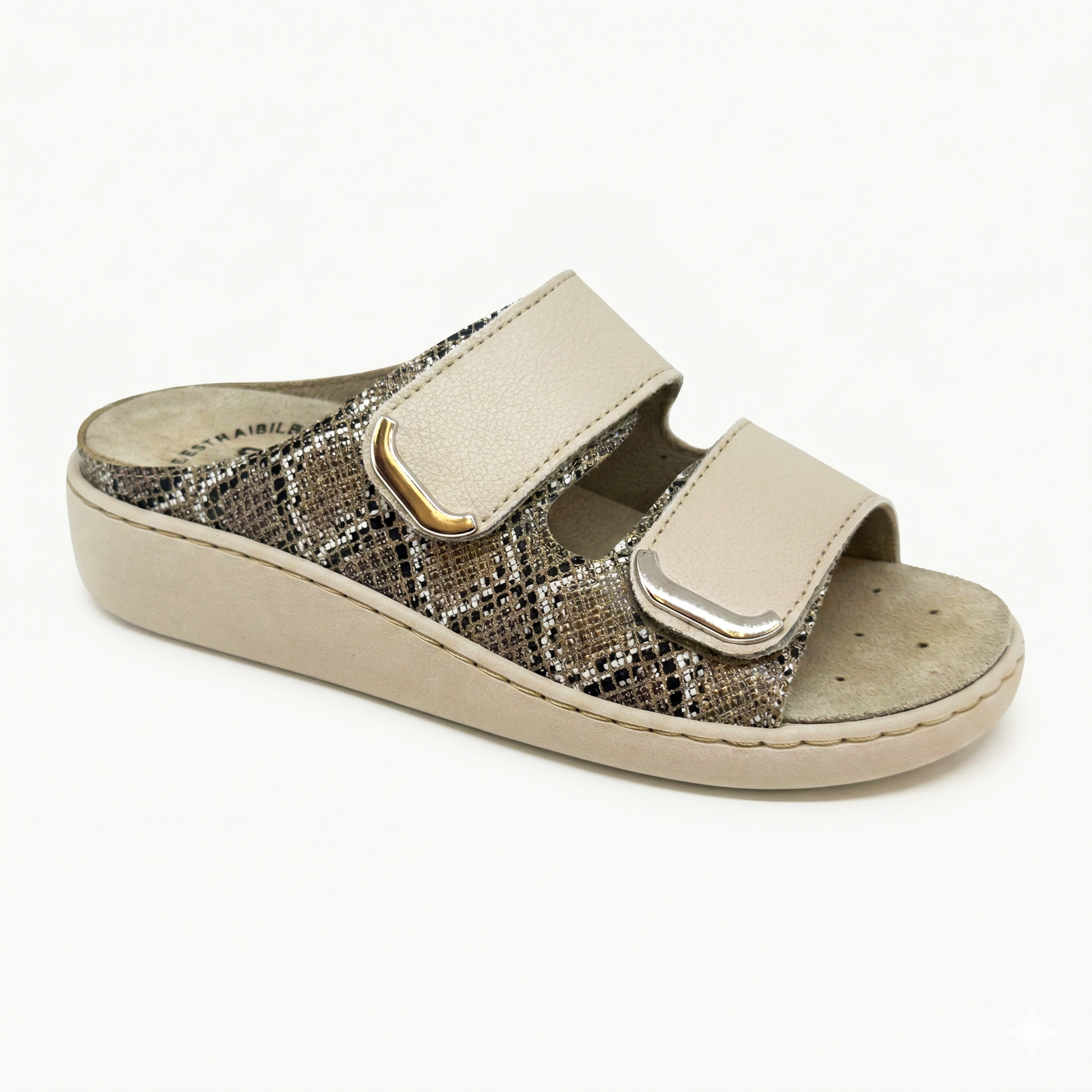 Ciabatte 3Rose ideali per la casa e l’esterno. Realizzate con tomaia in ecopelle e stampa pitonata effetto laminato, uniscono stile e funzionalità. La doppia fascia regolabile con velcro garantisce una calzata comoda e personalizzata. Il sottopiede è in pelle, con plantare anatomico estraibile per essere eventualmente sostituito con un vostro plantare ortopedico. Il fondo in gomma antiscivolo, leggero e flessibile, tacco da 4,5 cm che assicura stabilità e comfort.