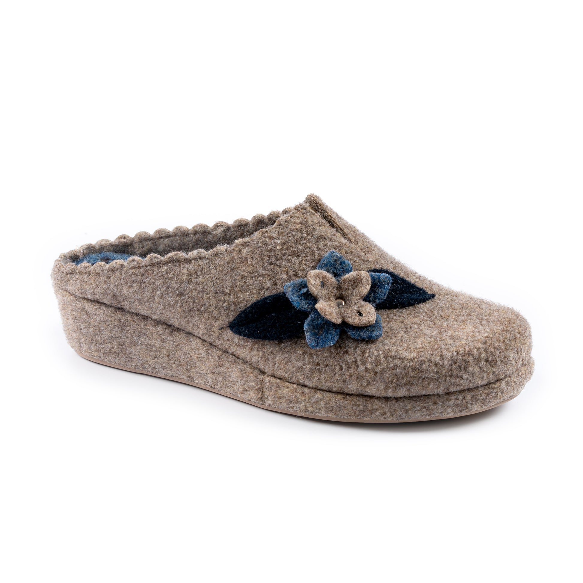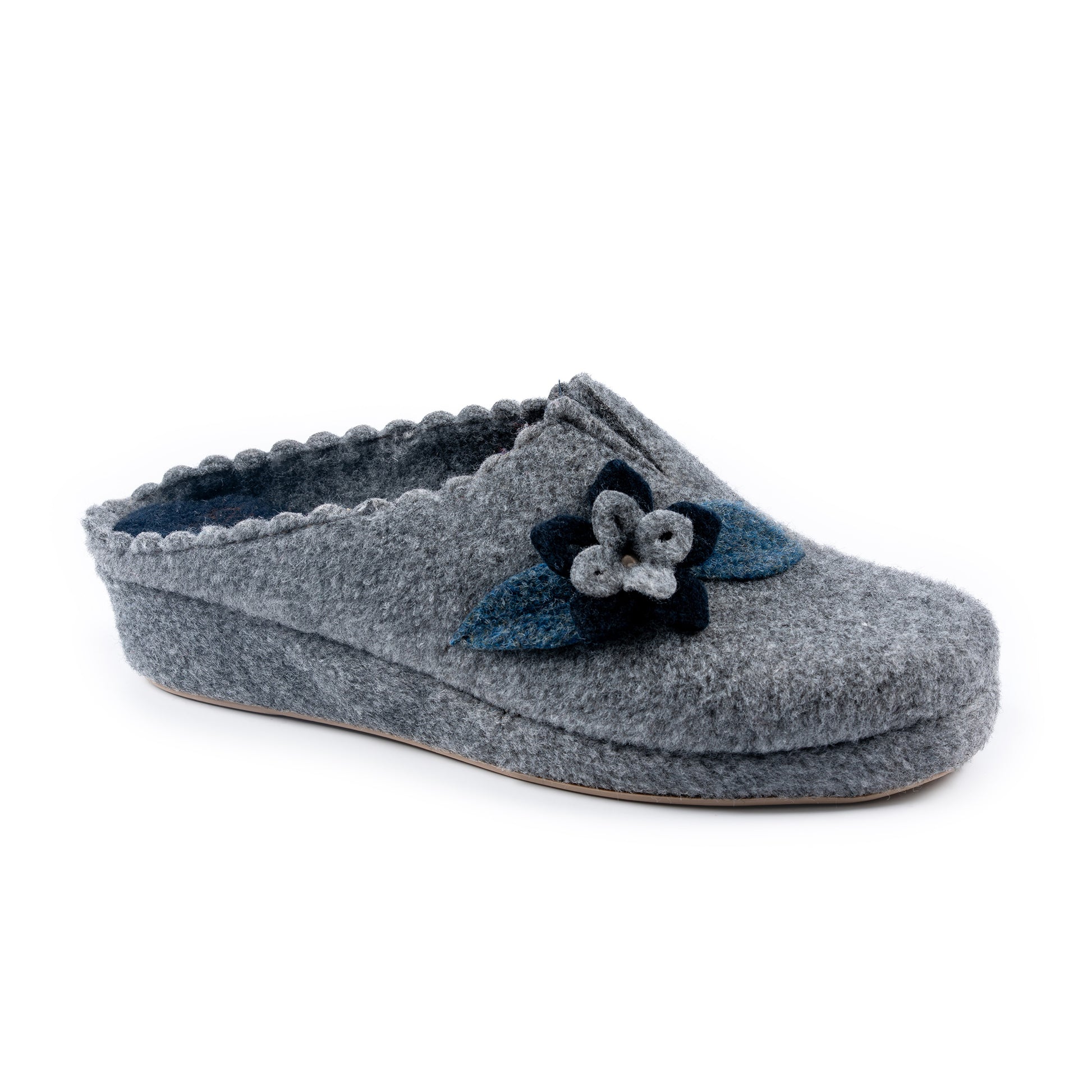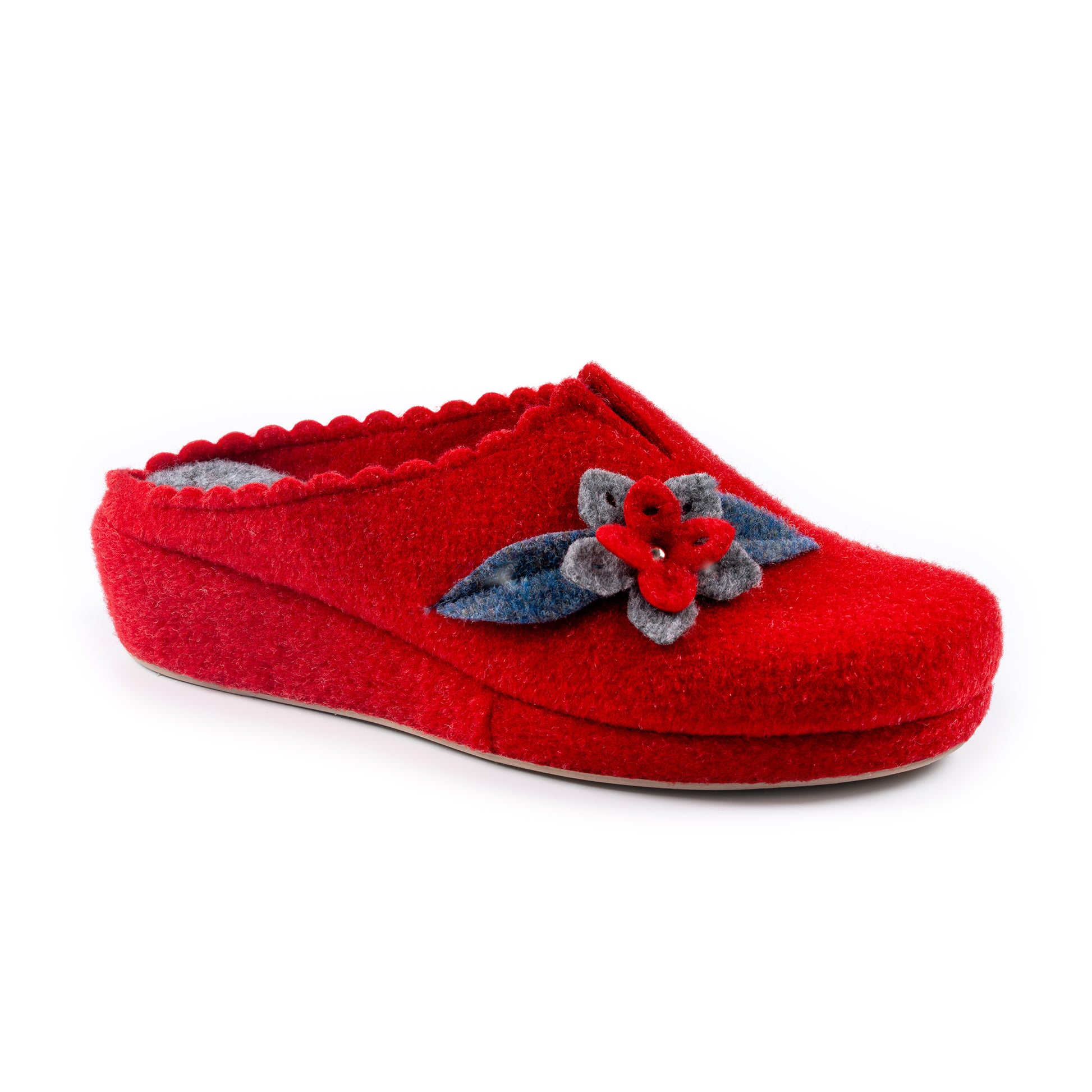 Calda e comoda, la ciabatta con tomaia in feltro e riporto floreale è perfetta per i mesi invernali. La zeppa in sughero rivestita in feltro e il sottopiede in feltro offrono comfort e supporto, mentre la suola antiscivolo e la zeppa da 3,5 cm garantiscono stabilità e sicurezza in ogni passo. Disponibile nei colori grigio, beige, rosso, blu.