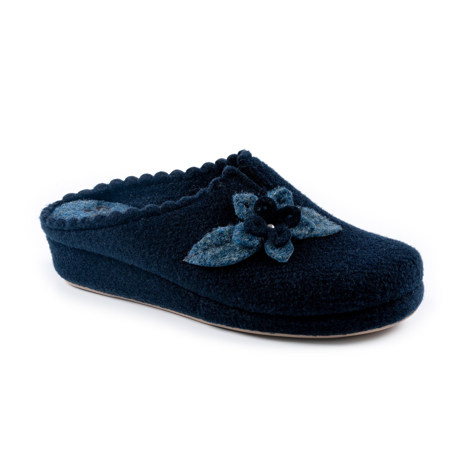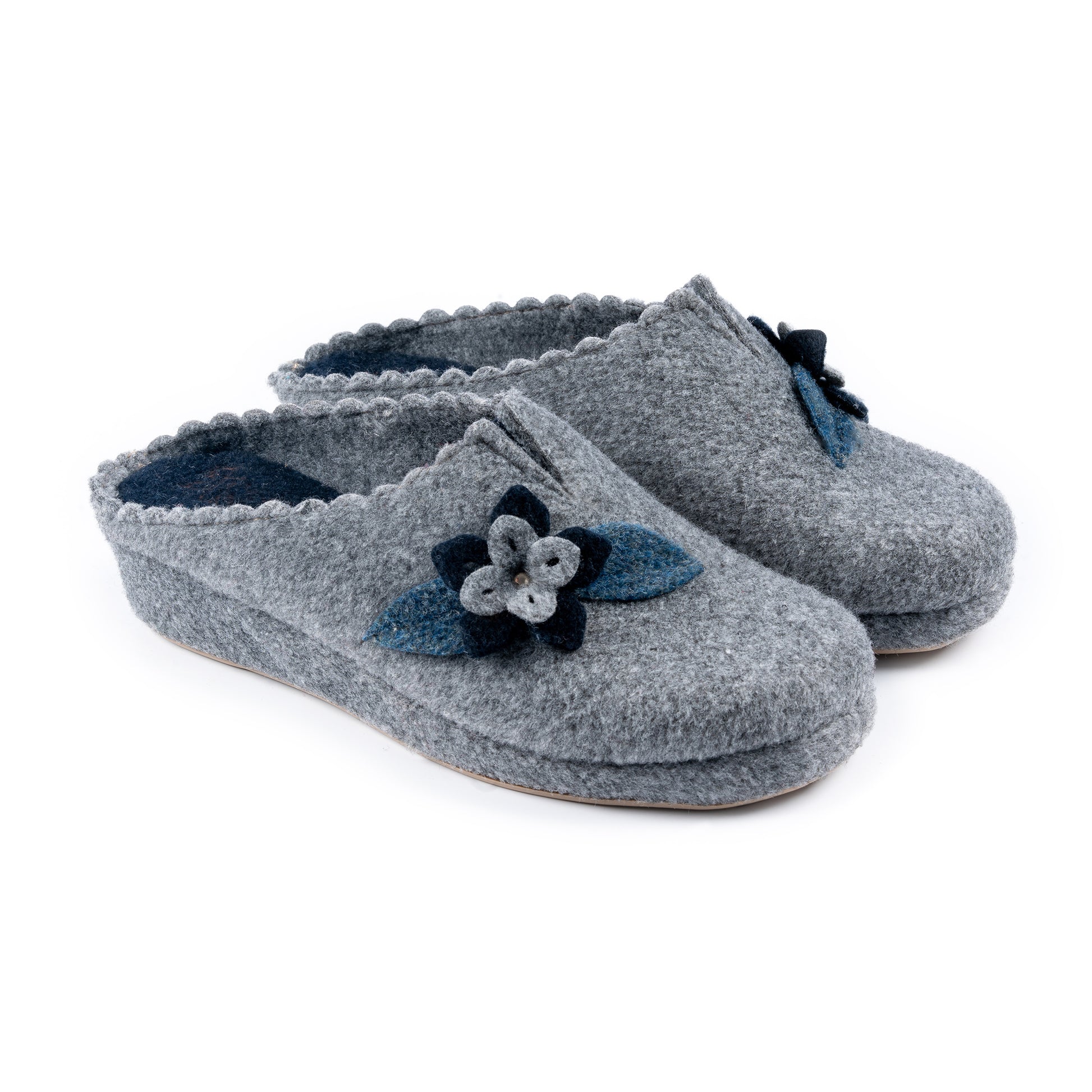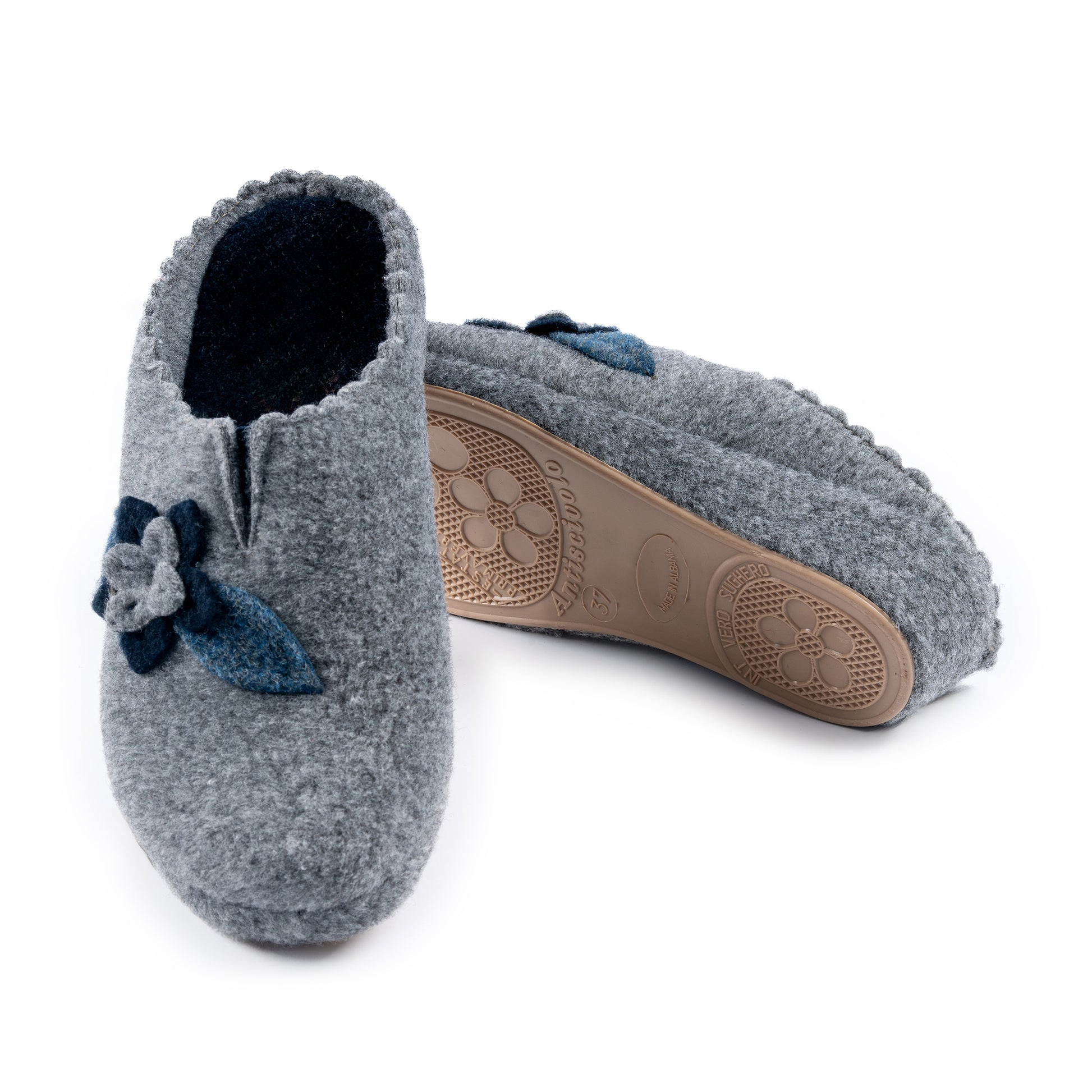 Calda e comoda, la ciabatta con tomaia in feltro e riporto floreale è perfetta per i mesi invernali. La zeppa in sughero rivestita in feltro e il sottopiede in feltro offrono comfort e supporto, mentre la suola antiscivolo e la zeppa da 3,5 cm garantiscono stabilità e sicurezza in ogni passo. Disponibile nei colori grigio, beige, rosso, blu.