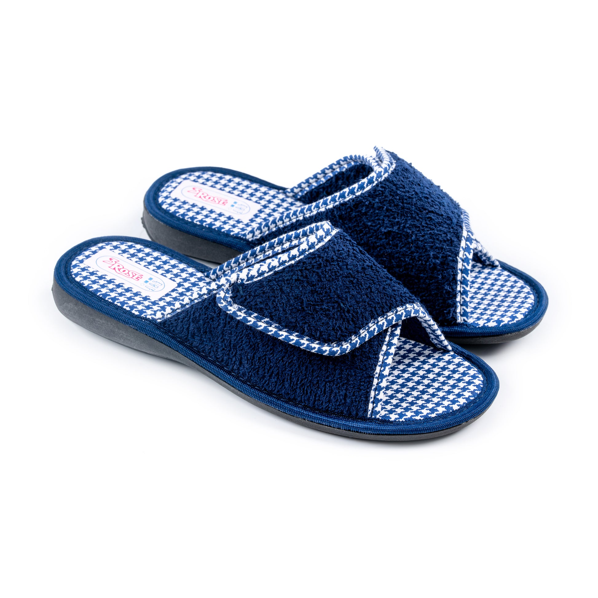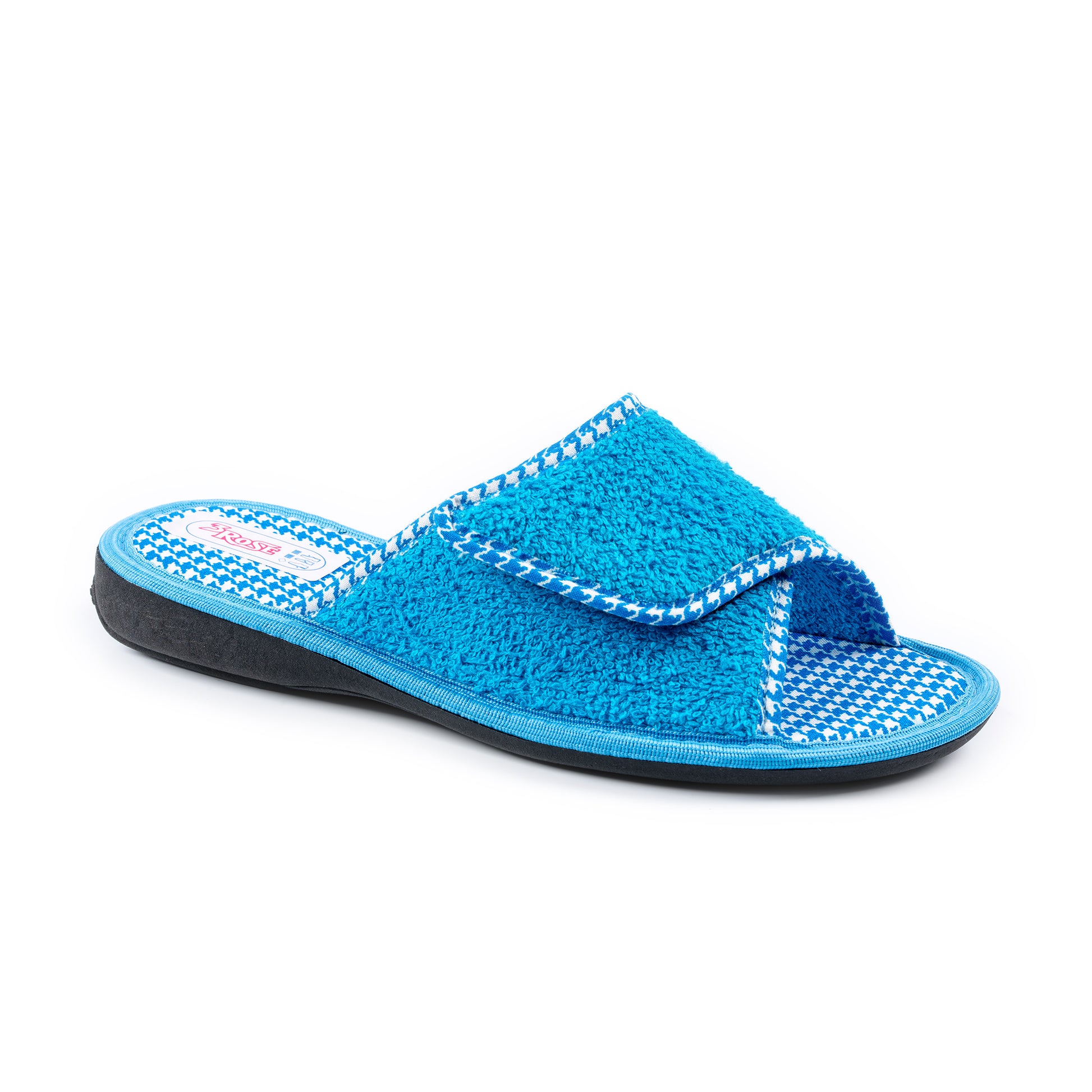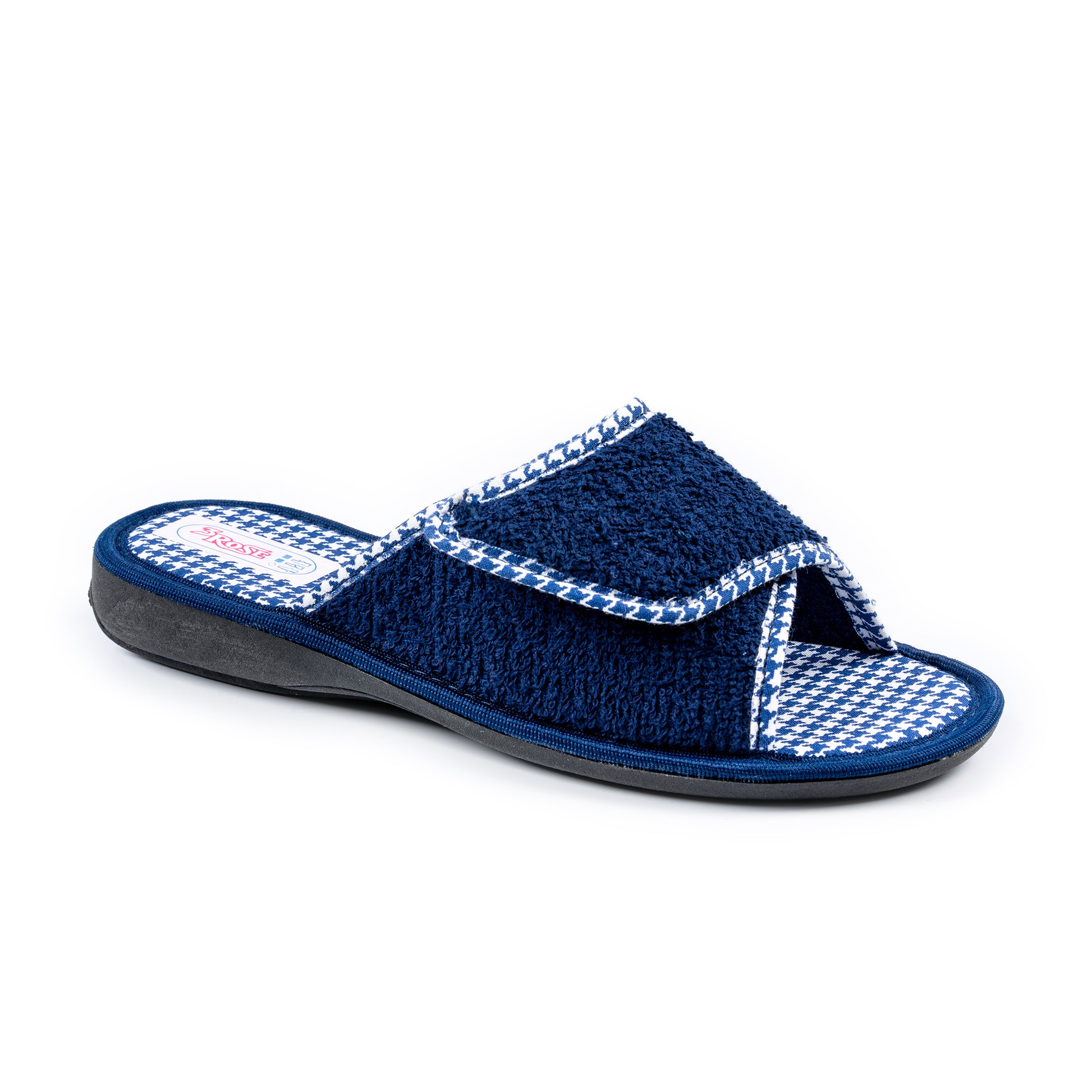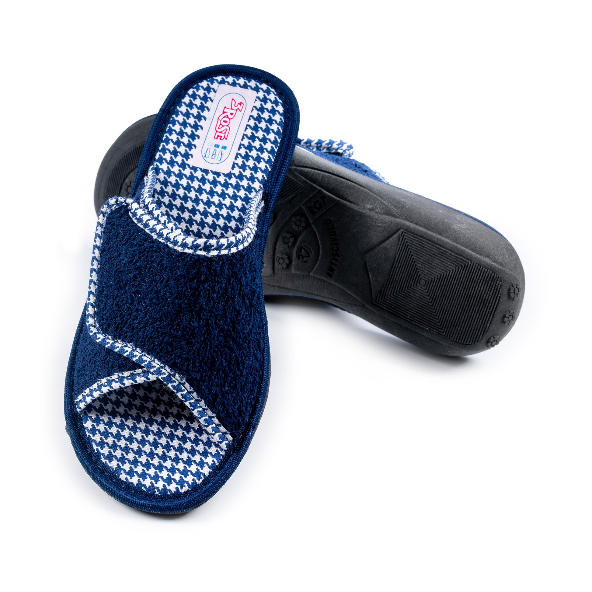Ciabatte 3Rose con tomaia e fodera in spugna, dotate di chiusura regolabile in velcro per una calzata comoda e personalizzata. Il sottopiede imbottito in tessuto offre morbidezza e comfort, mentre la suola antiscivolo garantisce stabilità. Tacco alto 1,5 cm.